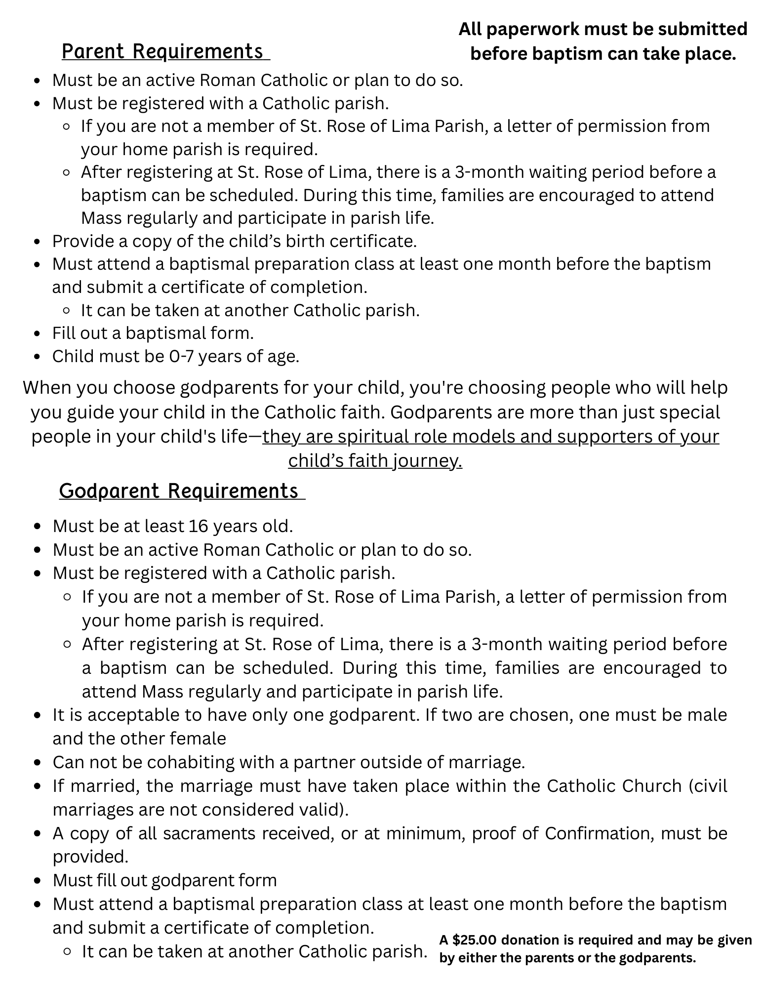 The godparents, also known as the sponsors, need to be registered in their parish where they are actively practicing their faith, be in full sacramental communion, be confirmed, be at least 16 years of age, and have recently completed a baptismal preparation class. There may be one male godparent and one female godparent. They need not be related or married, but can be. If you desire someone to be a godparent and they cannot be present, a proxy may stand-in for them.