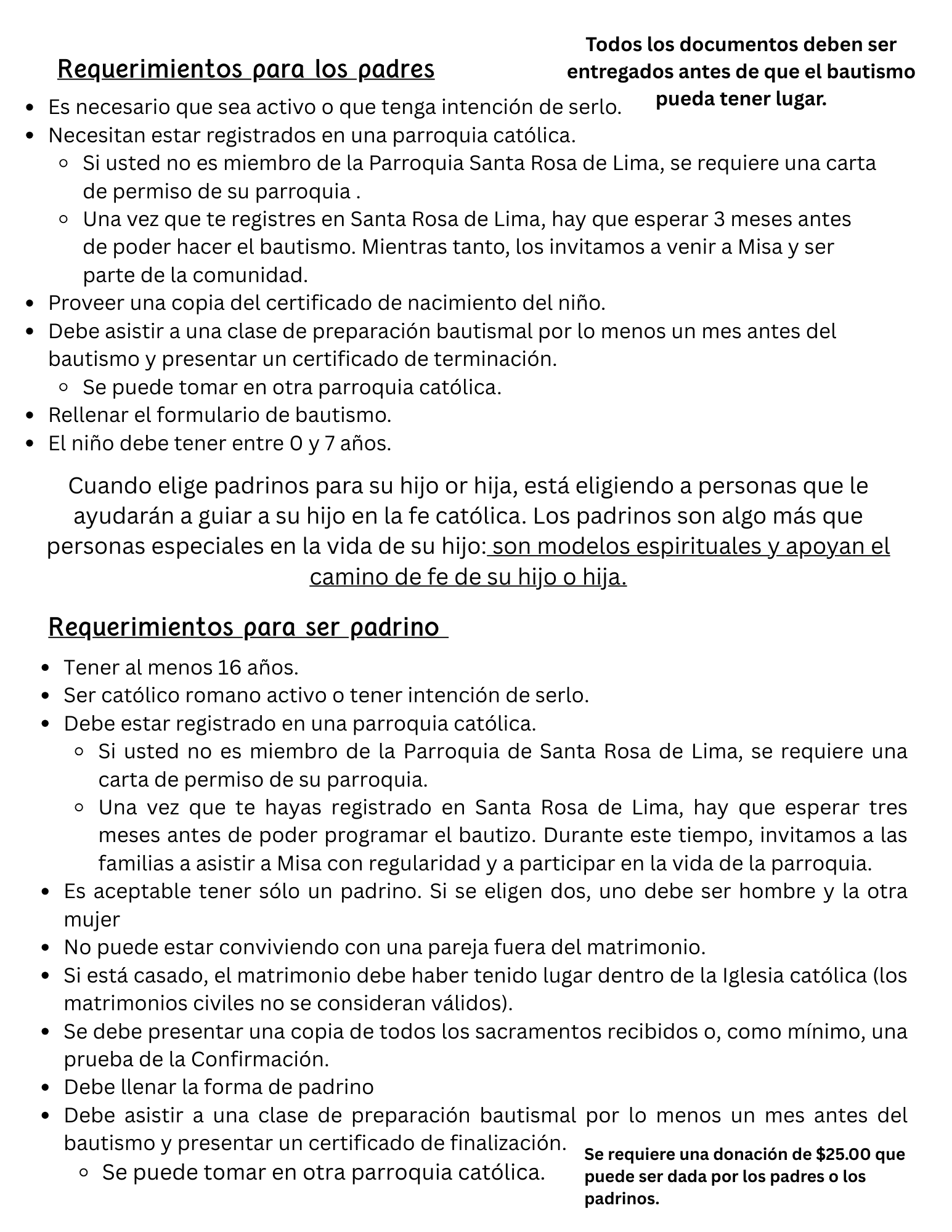 Parents and godparents are required to take a baptism preparation class, when they have not attended one within the past two years. To be exempt from taking this class, you will need to provide your certificate of completion to our office that demonstrates you have taken the class in the past two years, or a letter/form from your pastor stating you have taken the class elsewhere. The class will cover the theology of the sacrament, symbolism, and most importantly what parents and godparents will be publicly asked during the ceremony. Classes are offered in person, once a month. Contact our office to register for our in-person class and inquire about our schedule.